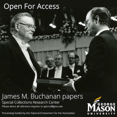 The University Libraries cordially invite you to the opening of the Nobel Prize-winning economist's James M. Buchanan papers that has been closed since 2021 for an NEH-funded project to organize and describe material documenting his career and research from 1930 to 2014. Dr. Peter Boettke, Buchanan scholar and Mason professor, will be the featured speaker. The Project Archivist, Rebecca Thayer, will be joining us virtually. You can learn more about the scope and content of the collection here. See below for details on the event.