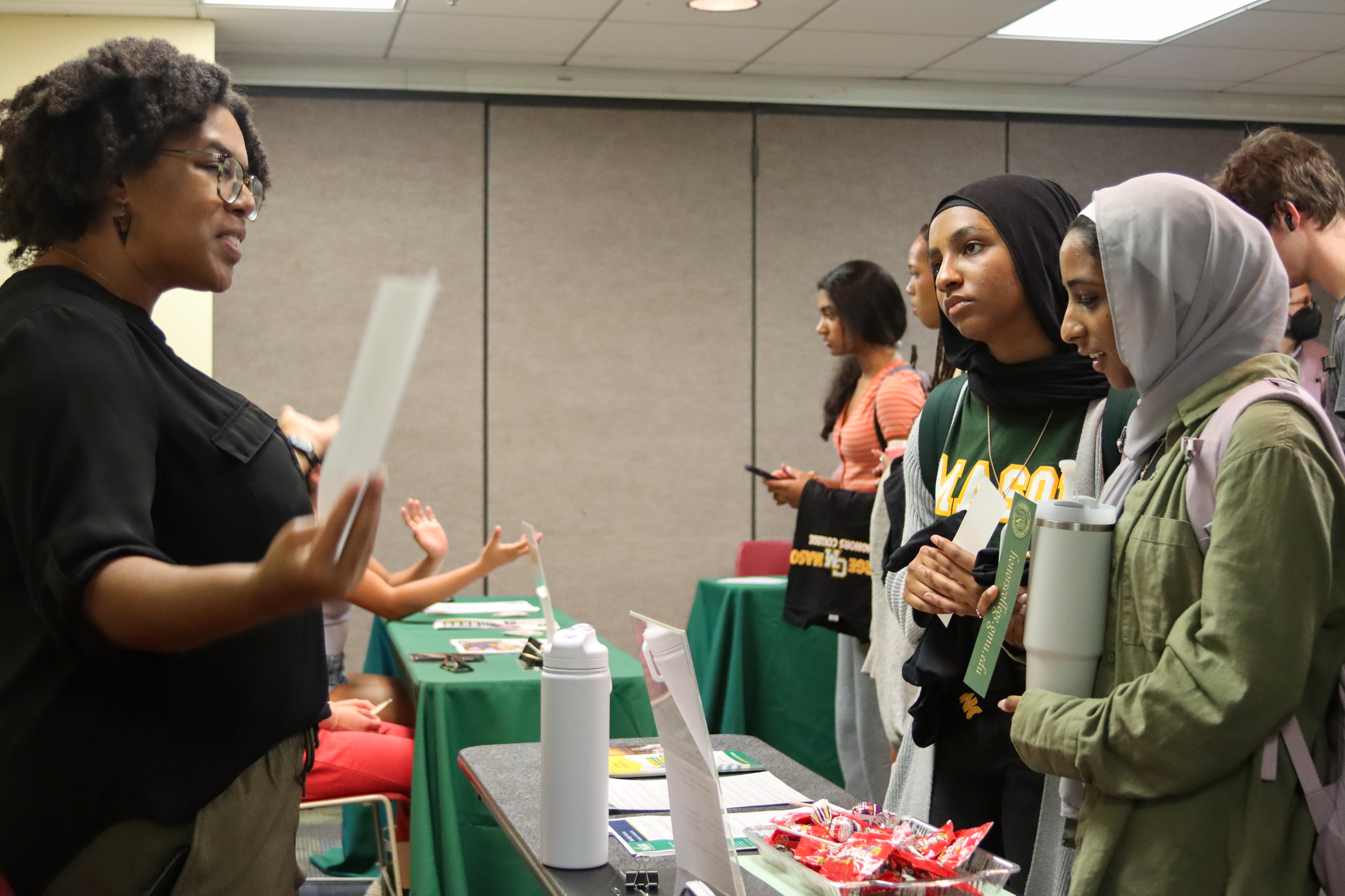 Students circle around the tables, intently nodding as Honors College advisor Michael Hock encourages them to schedule a meeting with their academic advisor. This was one of the many resources offered at Mason’s Honors College Resource Fair on Tuesday, September 5, 2023. This annual event aims to increase students’ access to the many resources that are connected to the Honors College.