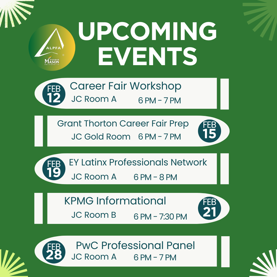 Join ALPFA, the Association of Latino Professionals for America, at their upcoming career workshops and networking panels during the month of February. Students can register to attend on Mason360.
