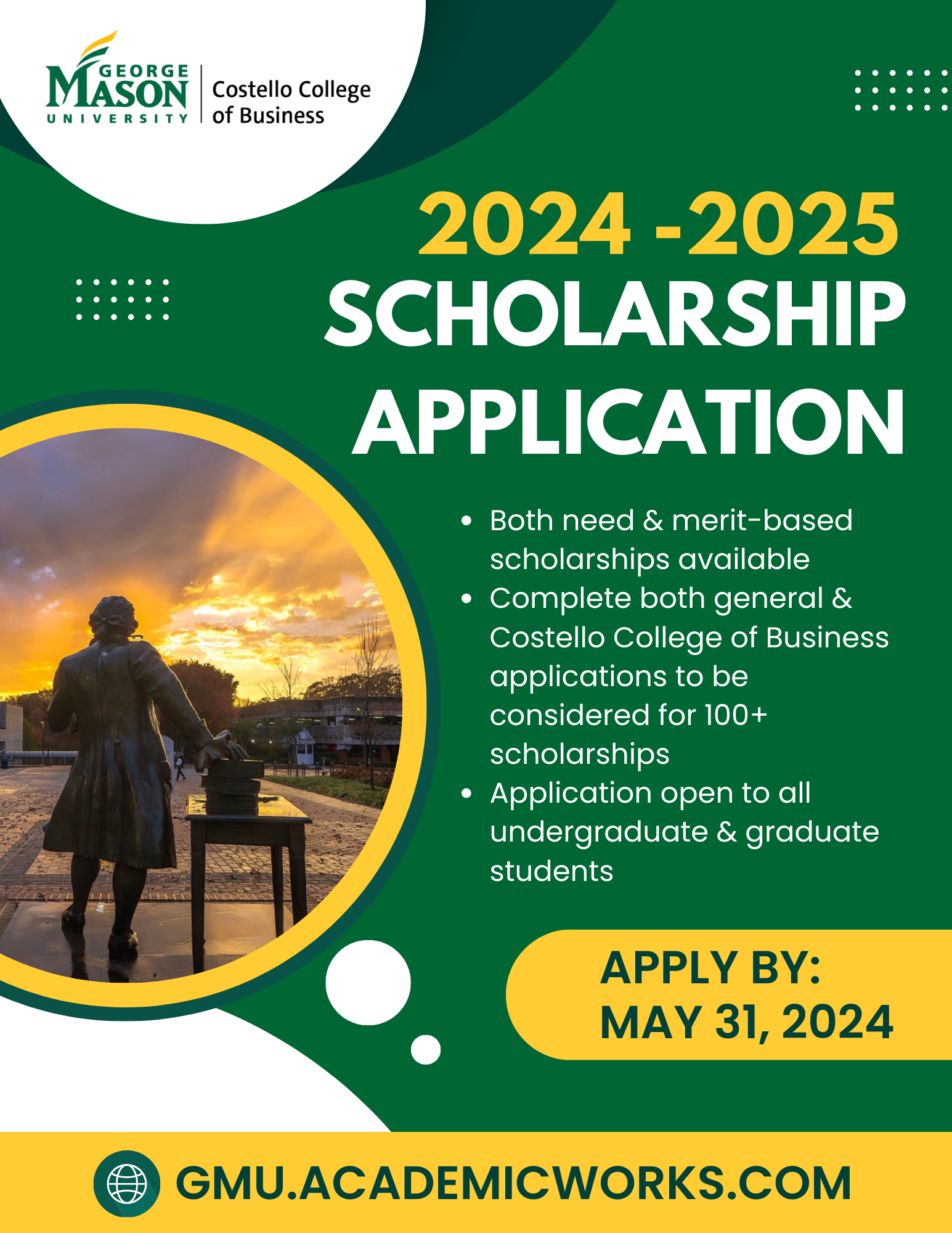 To apply for scholarships, go to the Mason Scholarship Application or visit: https://gmu.academicworks.com/. The application deadline is May 31, 2024.