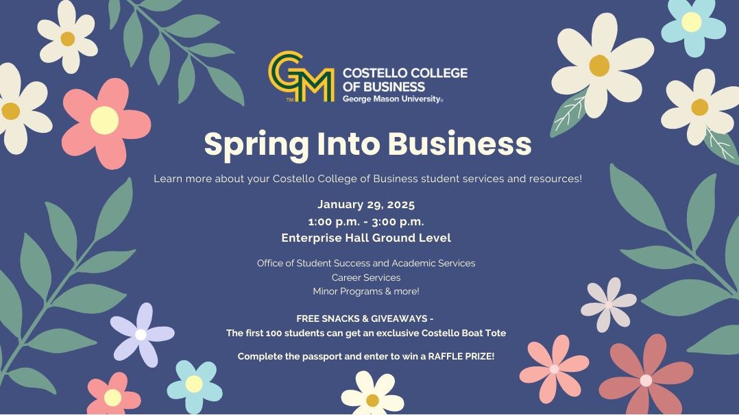 Ready to kick off the semester by learning about all that the Costello College of Business has to offer? Join us for Spring Into Business on Wednesday, January 29 from 1:00-3:00 p.m. on the Lower Level of Enterprise Hall, just outside Room 008!