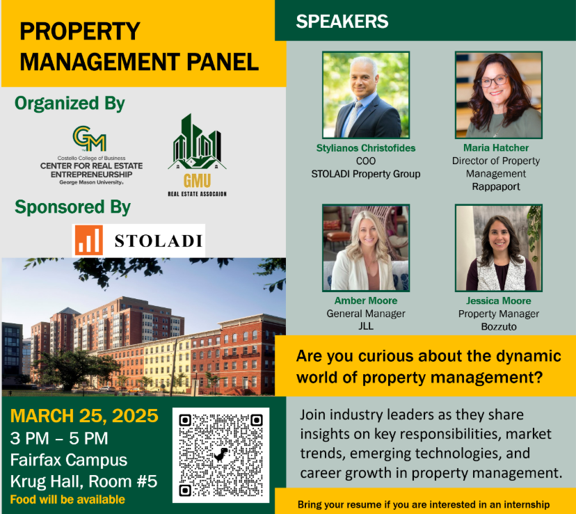 Are you a GMU student curious about the exciting world of property management? Join us for an exclusive Property Management Panel designed to help you explore career opportunities in this dynamic industry as top professionals share insights on key responsibilities, industry trends, emerging technologies, and career growth opportunities. Don't miss this chance to gain valuable knowledge, network with industry experts, and explore potential internship opportunities. See the details below: