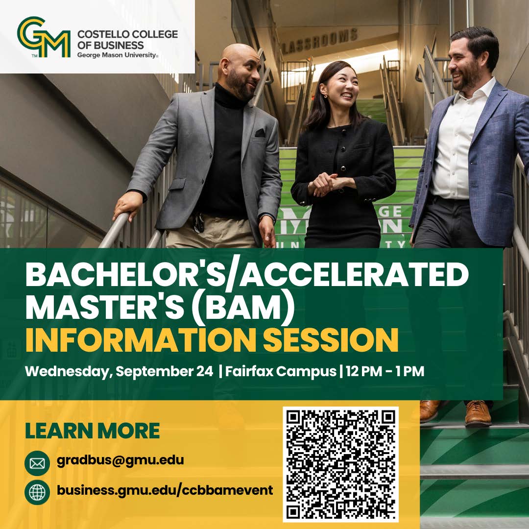 Join admissions representatives from the Costello College of Business as we discuss our BAM (Bachelor's-Accelerated Master's) pathways. By staying with George Mason for your graduate program, you can use the Bachelor's to Accelerated Master's (BAM) pathways to earn your undergraduate and graduate degrees months faster and for less money than the traditional model.