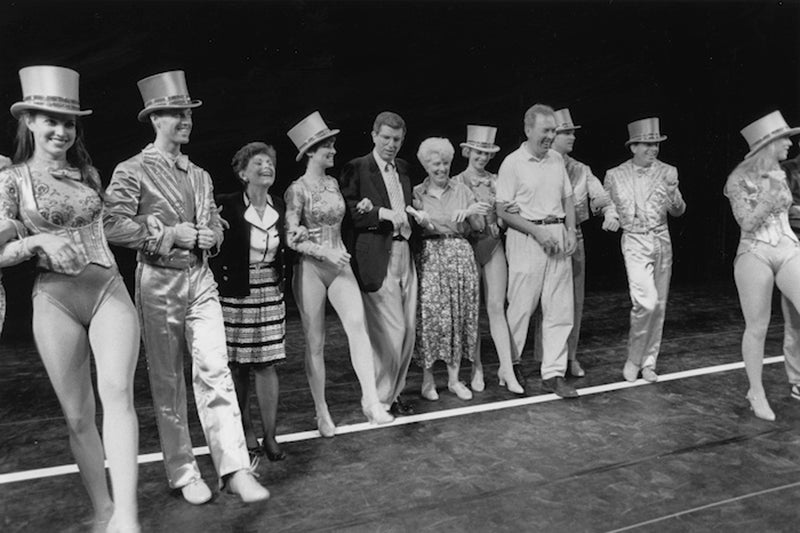 President George Johnson and first lady Joanne Johnson practice the final number with dancers from Hamlisch’s “A Chorus Line” for the Center for the Arts opening night. Photo credit: Steve J. Sherman. From George Mason University Photo Collection, Box 90, Folder 1, Special Collections Research Center, George Mason University Libraries
