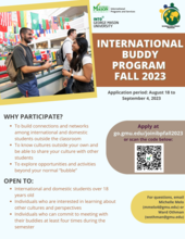 The Office of International Programs and Services is accepting applications for the International Buddy Program for Fall 2023. The International Buddy Program aims to build cross-cultural friendships, build intercultural communication skills, and global competency between Mason's international and domestic students.